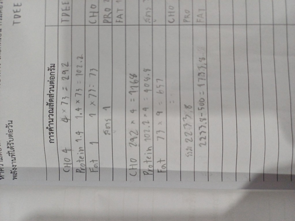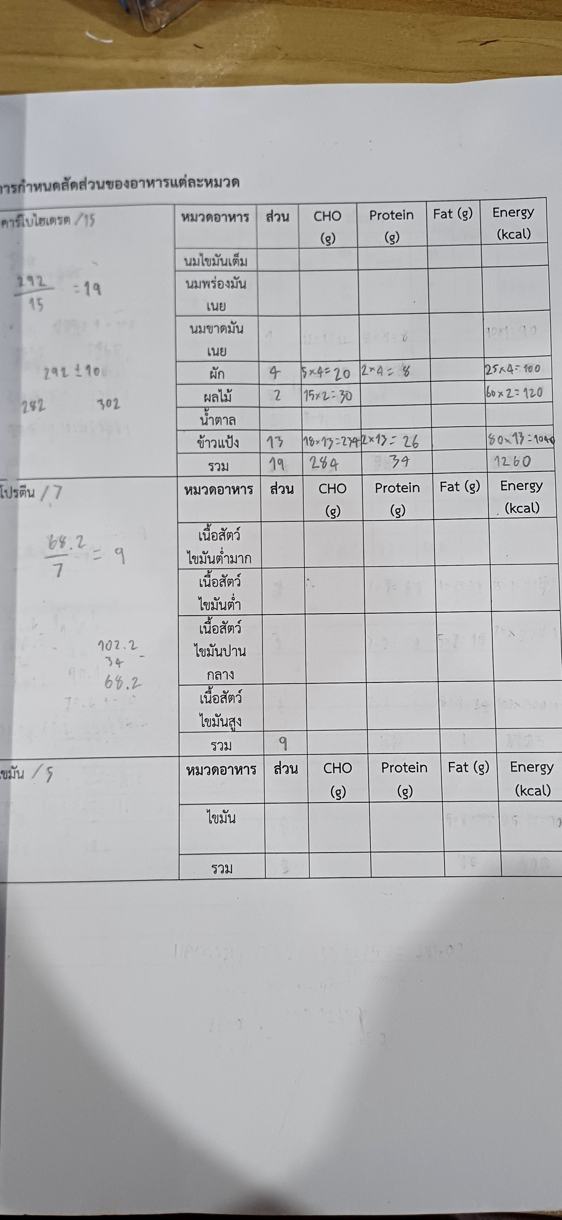 อิงจากรูปภาพคือผมกำหนดสัดส่วนอาหารครับของคาร์โบ โปรตีน และไขมัน คือคาร์โบผมทำได้แล้วครับแต่ติดปัญหาที่โปรตีนกับไขมันซึ่งผมคำนวณหลายวิธีแล้วEnergyรวมของทั้ง3ส่วนเกิน1733ครับอิงจากรูปเลยโปรตีนผมได้9ส่วนจะแบ่งส่วนยังไงครับให้พอดีแล้วนำไขมันจากโปรตีนไปลบ73ของไขมันหารด้วย5จะได้ส่วนของไขมันแล้วนำส่วนไปคูณกับ45ครับซึ่งผมคำนวณหลายรอบมันเกินตลอดเลยครับ