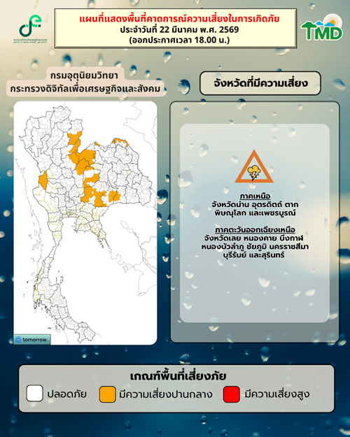 วันที่ 22 มี.ค.2569 กรมอุตุนิยมวิทยา พยากรณ์อากาศ 24 ชั่วโมงข้างหน้า ประเทศไทยตอนบนมีอากาศร้อนในตอนกลางวัน โดยมีฝนฟ้าคะนองกับลมกระโชกแรงบางแห่ง เนื่องจากความกดอากาศต่ำเนื่องจากความร้อนปกคลุมประเทศไทยตอนบน