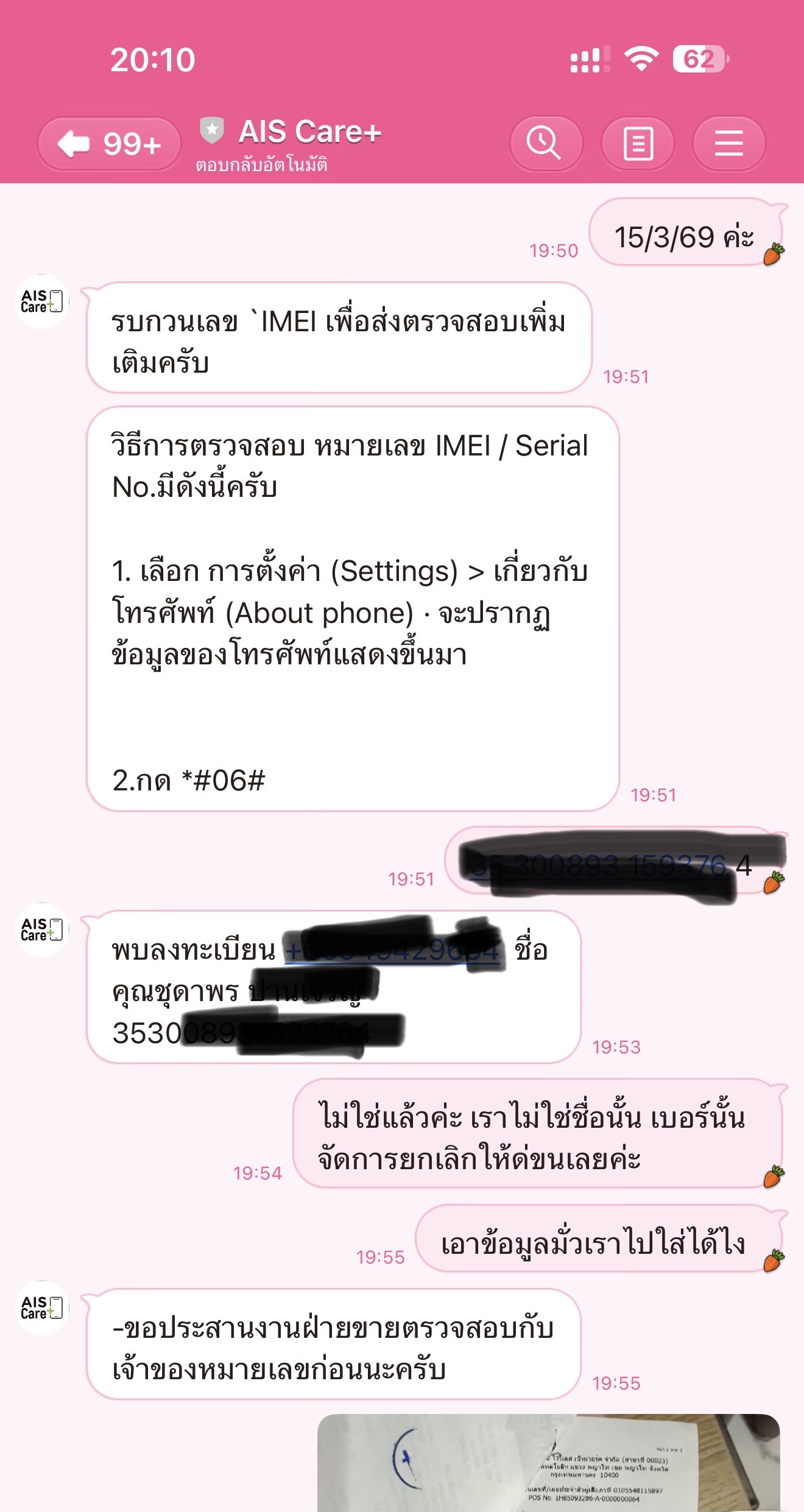 แฟนผมได้ซื้อ iPhone 17 Pro Max ในงาน เครื่องพร้อมแพคเกจ เบอร์เดิม ทางเซลล์เสนอบริการ Apple Care+ ฟรี 1 เดือน ถ้าไม่ใช้ต่อให้ไปยกเลิกที่ช้อป เราบอกแล้วว่าไม่เอา ไม่อยากเสียเวลาไปยกเลิกที่ช้อป(หากไม่ต้องการใช้ต่อ) ทางเรายืนยันหนักแน่นว่าไม่เอาบริการนี้ จนกระทั่งเรามาเช็คประกันที่หน้าเว็บ Apple และในตัวเครื่องเอง เอะใจตรงประกันไม่ขึ้น เลยโทรไปถามSupport ของApple ประกันไม่โชว์วันหรือระยะเวลาสิ้นสุดประกัน ทางเจ้าหน้าที่ Apple บอกว่ามีบริการนี้สมัครไว้ ทำอะไรไม่ได้ โทรหา Ais CC 1175 ประสานงานบอกตรวจสอบไม่พบข้อมูลการสมัคร จึง Add Line ไปสอบถาม @Aiscareplus จึงทราบว่ามีการสมัครบริการนี้ แต่ชื่อผู้ซื่อเครื่องกับเบอร์โทรที่ใช้ในการสมัคร ที่เจ้าหน้าที่ตอบกลับมา ไม่ใช่ชื่อแฟนเรา เบอร์โทรแฟนเรา เราอึ้งหนักมาก Ais ในงานเล่นอะไร ทั้งๆที่ชื่อในใบเสร็จ รายละเอียดที่อยู่ต่างๆ เป็นของแฟนเรา เจ้าหน้าที่ Ais Care+ บอกขอจะตรวจสอบ ประสานงานให้ อยากถามครับ ทำไมทำงานสะเพร่าอย่างนี้ เอาข้อมูลใครมาลงทะเบียน เรารู้สึกผิดหวังมาก เพราะเราอาจเสียสิทธิ์ในการใช้การรับประกันในอนาคต เพราะเป็นข้อมูลของใครไม่รู้ และเราไม่ต้องการบริการนี้แต่แรกอยู่แล้ว ฝากหน่วนงานที่เกี่ยวข้องตรวจสอบแก้ไขข้อมูลให้ถูกต้องโดยด่วนเลยนะครับ มันเป็นเรื่องของความถูกต้องนะครับ