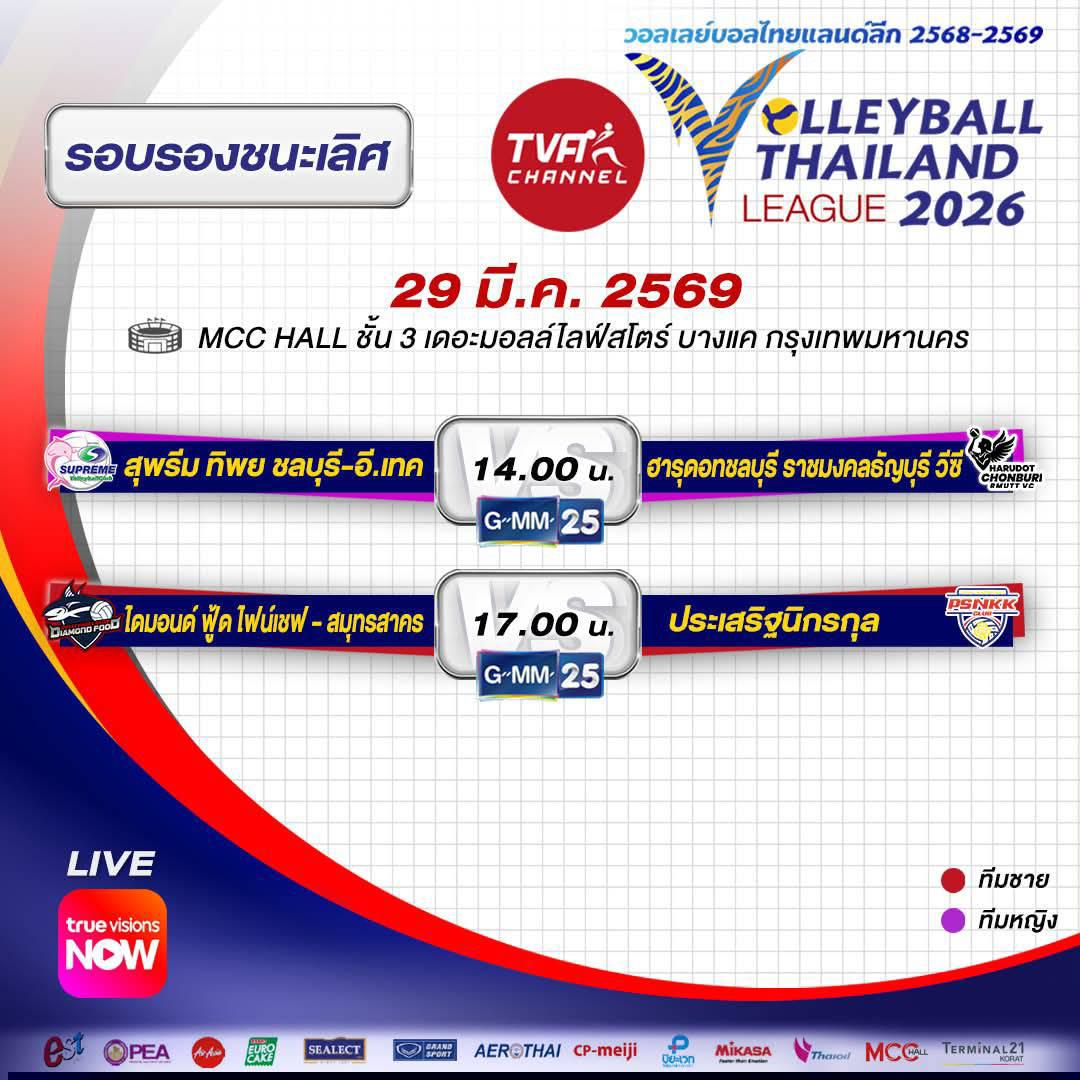 เชียร์สด วอลเลย์บอลไทยแลนด์ลีก 2026 เสาร์ที่ 21 มี.ค มีถ่ายฟรีทางทีวี