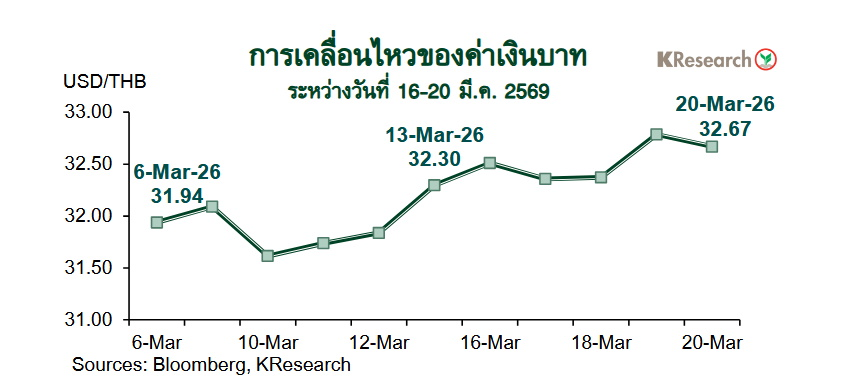 ส่วนสัปดาห์ระหว่างวันที่ 23-27 มี.ค. 2569 ธนาคารกสิกรไทยมองกรอบการเคลื่อนไหวของค่าเงินบาทที่ระดับ 32.30-33.20 บาทต่อดอลลาร์ฯ ขณะที่ศูนย์วิจัยกสิกรไทยประเมินปัจจัยสำคัญที่ต้องติดตาม ได้แก่ ตัวเลขการส่งออกเดือนก.พ. ของไทย สถานการณ์ในตะวันออกกลาง ทิศทางราคาน้ำมันในตลาดโลก ฟันด์โฟลว์ของต่างชาติและ ถ้อยแถลงของเจ้าหน้าที่เฟด