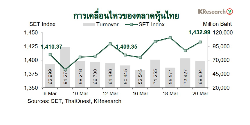 ในวันศุกร์ที่ 20 มี.ค. 2569 ดัชนี SET ปิดที่ระดับ 1,432.99 จุด เพิ่มขึ้น 1.68% จากระดับปลายสัปดาห์ก่อน ขณะที่มูลค่าการซื้อขายเฉลี่ยต่อวันอยู่ที่ 64,480.02 ล้านบาท ลดลง 8.96% จากสัปดาห์ก่อน ส่วนดัชนี mai เพิ่มขึ้น 0.47% มาปิดที่ระดับ 219.08 จุด
