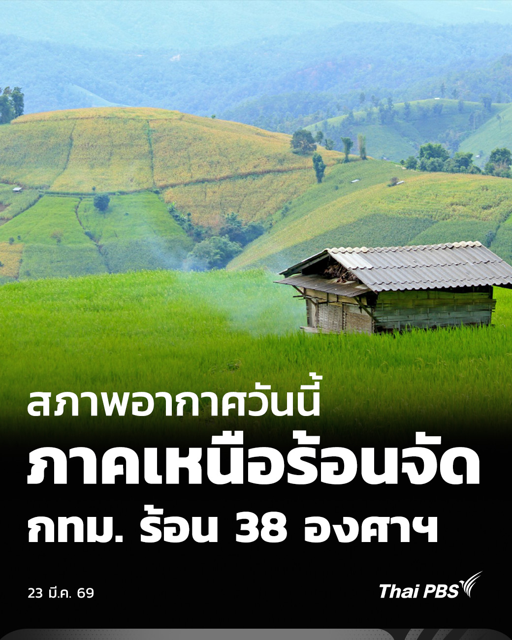วันนี้ (23 มี.ค. 69) กรมอุตุนิยมวิทยา พยากรณ์อากาศ 24 ชั่วโมงข้างหน้า ประเทศไทยตอนบนมีอากาศร้อนในตอนกลางวัน และมีอากาศร้อนจัดบางพื้นที่บริเวณภาคเหนือ โดยมีฝนฟ้าคะนองกับลมกระโชกแรงบางแห่ง เนื่องจากความกดอากาศต่ำเนื่องจากความร้อนปกคลุมประเทศไทยตอนบน ในขณะที่มีลมใต้และลมตะวันออกเฉียงใต้พัดปกคลุมในบริเวณดังกล่าว