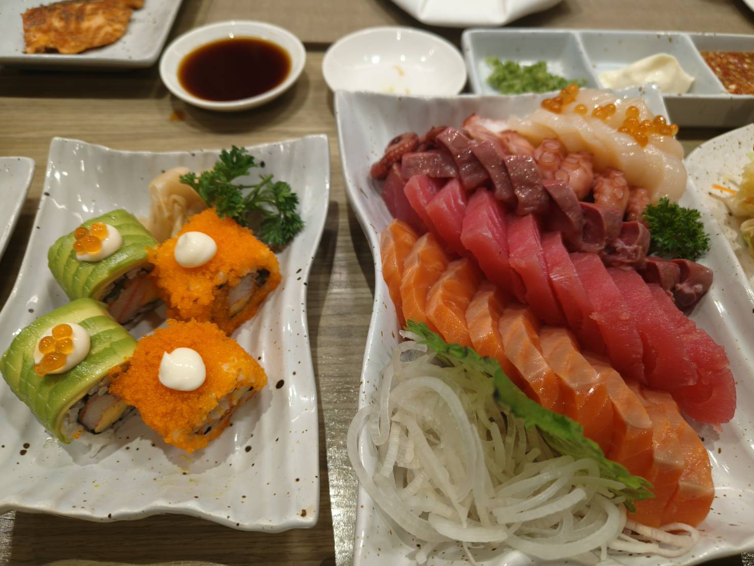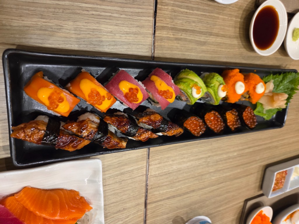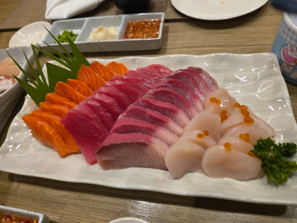 ซาซิมิ มีทั้งแซลมอน ทูน่า ฮามาจิ โฮตาเกะ ปลาหมึกยักษ์ สั่งได้เรื่อยๆ เเค่นี้ก็คุ้มราคามากๆเเล้ว
