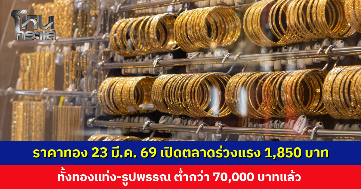 ราคาทองคำประจำวันที่ 23 มี.ค. 2569 เปิดตลาดร่วงลง 1,850 บาท ทำให้ขณะนี้ ทั้งทองคำแท่งและทองคำรูปพรรณ ราคาต่ำกว่า 70,000 บาท