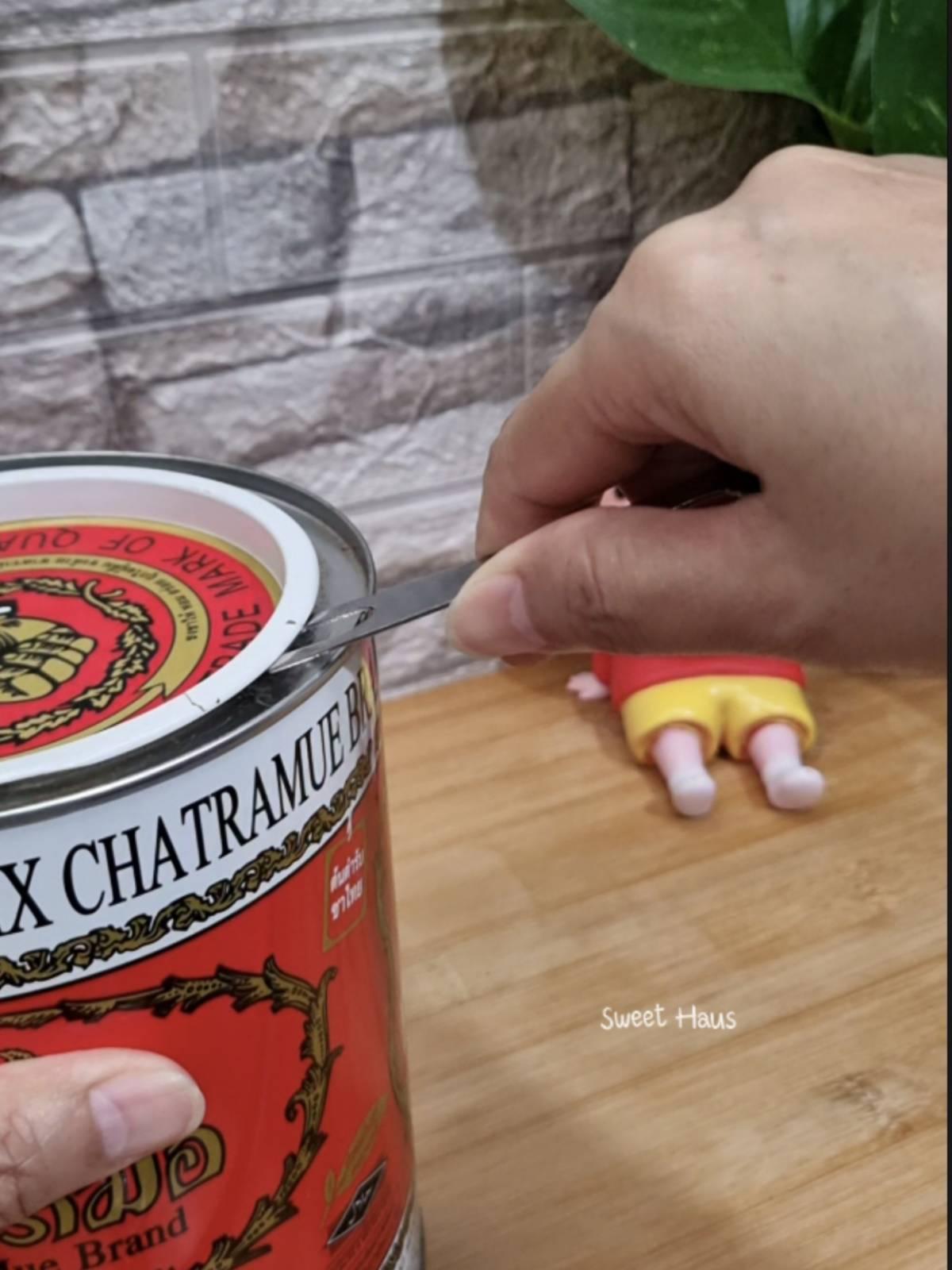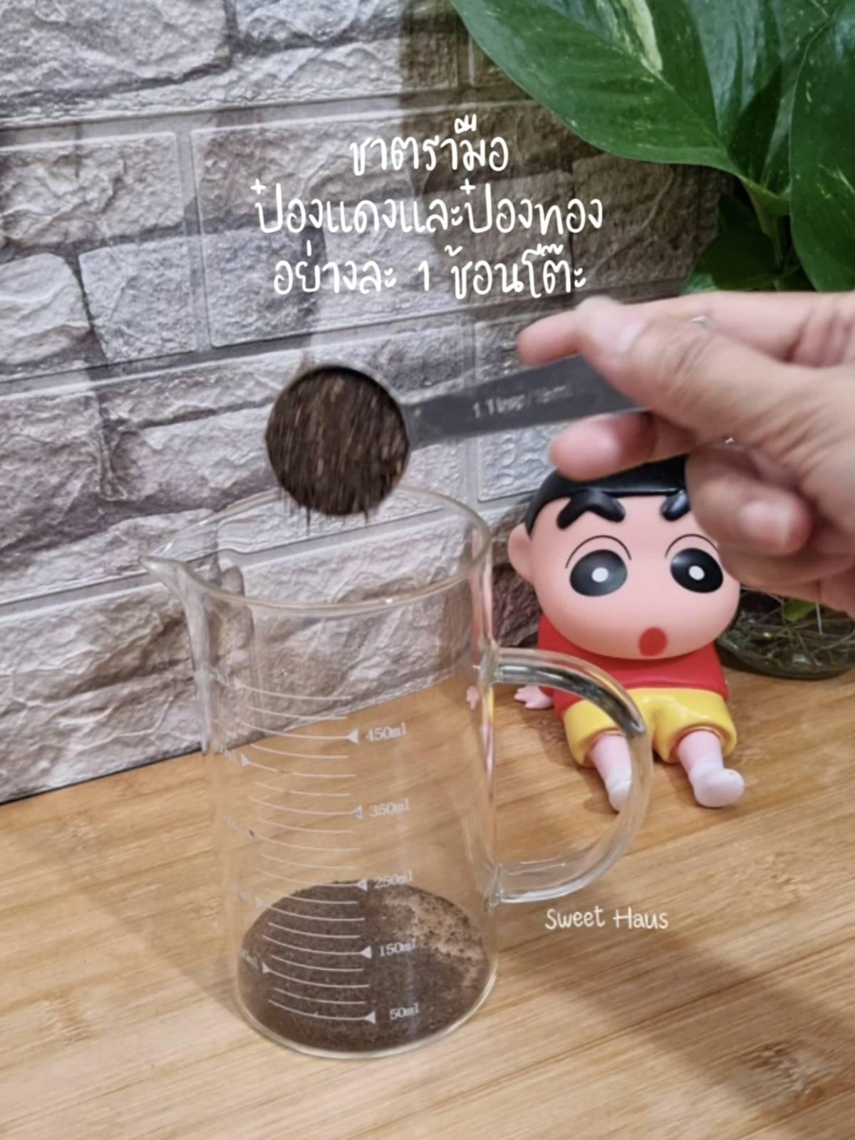 ใช้ชาตรามือกระป๋องแดง 1 ช้อนโต๊ะ กระป๋องทอง 1 ช้อนโต๊ะ