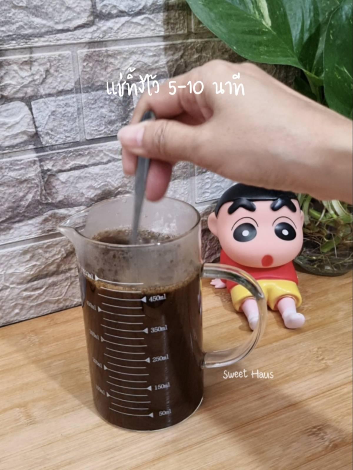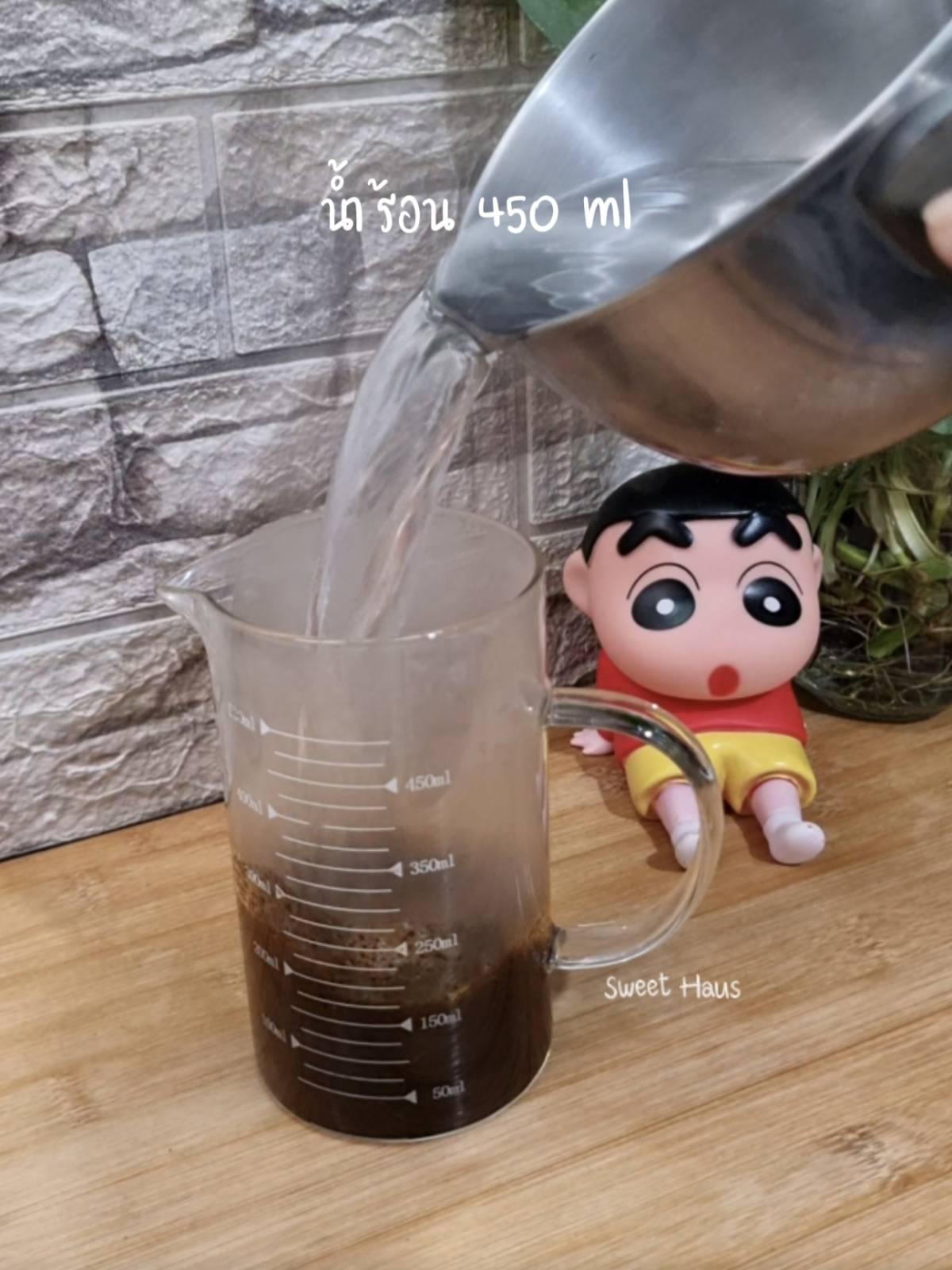 เติมน้ำร้อน 450 ml คนให้ชาจมน้ำ แช่ทิ้งไว้ 5-10 นาที