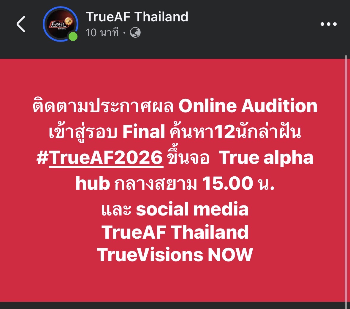 True Academy Fantasia 2026 ข่าว AF อัปเดตล่าสุดสำหรับคนที่อยากไปออดิชั่น สมัครได้ตั้งแต่อายุ15ปีขึ้นไป ไม่จำกัดเพดานอายุ แล้วออดิชั่นพร้อมกันต้นปี 2026 🔥
