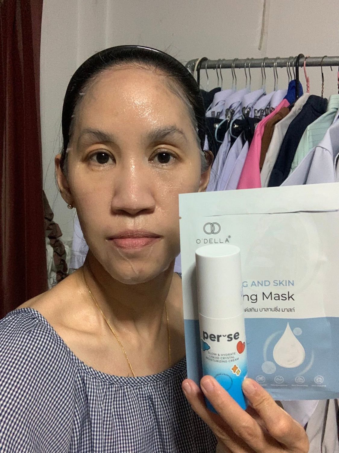 จากนั้นทา Per Se Thailand Glow & Hydrate Liquid Crystal Moisturizing Cream ก่อน จะช่วยให้สารสกัดในมาสก์ลงผิวได้มากขึ้น