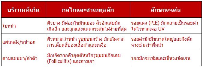 • วัยผู้ใหญ่ (45 ปีขึ้นไป): ผิวเริ่มบางและแห้ง กระบวนการซ่อมแซมช้ามาก รอยสิวอาจกลายเป็น "จุดด่างดำถาวร" หรือผสมโรงไปกับฝ้ากระตามวัย (Solar Lentigo)