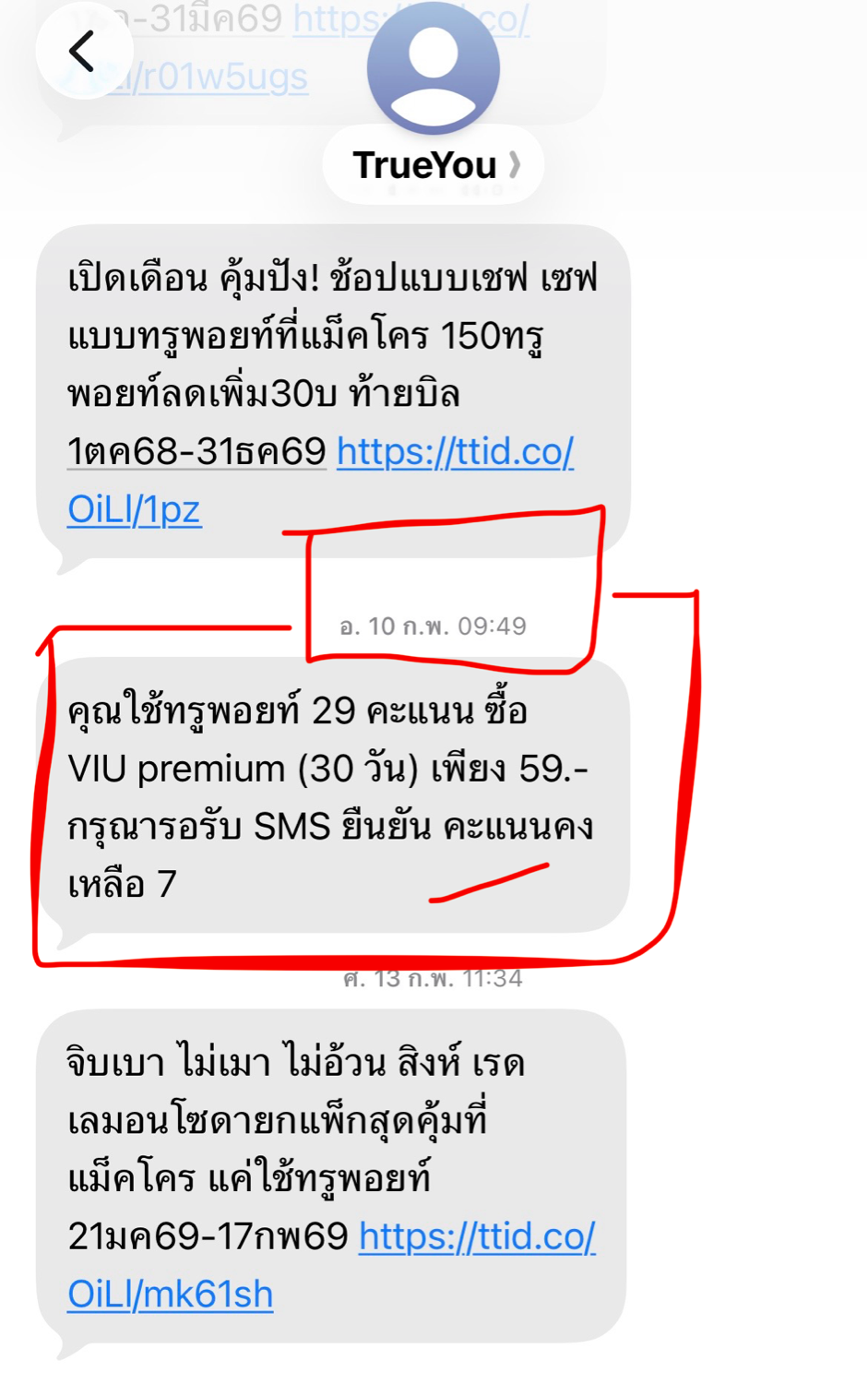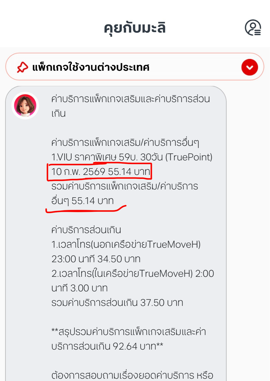 เมื่อเรา สมัครVIU ราคาพิเศษ 59บ. 30วัน (TruePoint) แต่ใช้วิธีแลกTruePoint29 คะแนน คะแนนโดนหักปกติ ตั้งแต่วันที่กดแลกคะแนน เริ่มวันที่ 10 ก.พ. 2569 และหมดอายุการใช้งาน 11 มี.ค 2569 พอมาเช็คยอด จะชำระบิล แต่ทำไมถึงคิดค่าบริการเป็นส่วนเกิน ในแอปที่แชทคุยกับมะลิ ต้องจ่ายไหม หรือ เป็นปกติที่แลกคะแนน ก็ต้องจ่ายค่าสมัครบริการVIU หรือไม่ แล้วจะติดต่อทรูยังไง ให้คุยกับเจ้าหน้าที่คะ