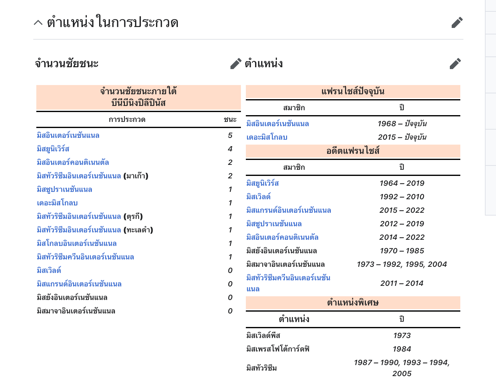 ตำแหน่งการประกวดที่ได้ในแต่ละเวที