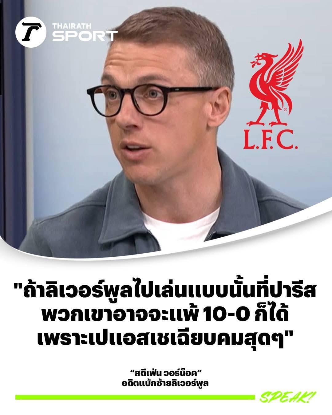 สตีเฟน วอร์น็อค อดีตแบ็กซ้ายของ "หงส์แดง" ลิเวอร์พูล ออกมาเตือน หงส์แดง ว่าพวกเขาอาจถูก ปารีส แซงต์-แชร์กแมง ถล่ม 10-0 ในศึกยูฟ่า แชมเปียนส์ลีก รอบ 8 ทีมสุดท้าย หากพวกเขาเล่นได้แย่เหมือนกับเกมที่บุกไปแพ้ ไบรท์ตัน 1-2 ในศึกพรีเมียร์ลีก อังกฤษ เมื่อวันเสาร์ที่ผ่านมา
