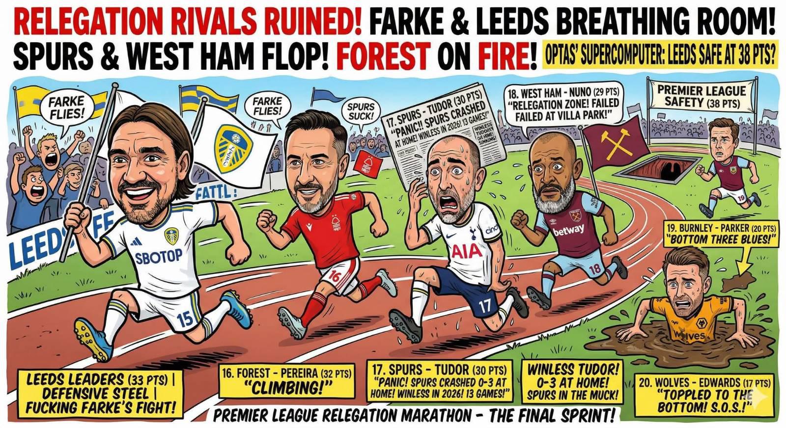 โดยตอนนี้เหลือการแข่งขันอีกแค่ 7 นัดและทีมในกลุ่มดิ้นรนหนีตายก็เหลือหลักๆ 6 ทีมแต่ในกระทู้นี้จะขอสรุปสถานการณ์แค่ 4 ทีมคือ ลีดส์ / น็อตติงแฮม ฟอเรสต์ / สเปอร์ส / เวสต์แฮม ส่วน เบิร์นลีย์ กับ วูลฟ์แฮมป์ตัน จะขอตัดออกไปเนื่องจากเปรียบเสมือนคนตายที่ยังหายใจซึ่งโอกาสรอดตกชั้นน้อยเต็มที
