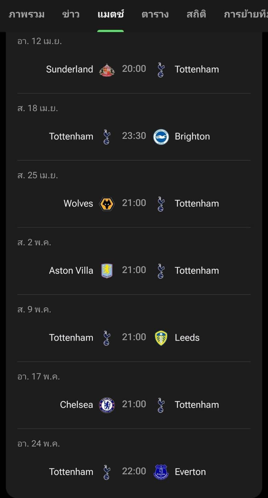- สถานการณ์ของทีมไก่จ๋าไม่ค่อยจะสู้ดีนัก หลังจากเปิดบ้านแพ้เละต่อทีมหนีตายด้วยกันอย่างฟอเรสต์จนร่วงไปอยู่ในอันดับ 17 โดยโปรแกรมที่เหลือของทีมไก่เดือยทอง พวกเขาจะมีเกมยากใน 4 นัดสุดท้ายทั้งการเจอทีมในกลุ่มลุ้นพื้นที่บอลยุโรปไม่ว่าจะเป็น แอสตัน วิลล่า / เชลซี / เอฟเวอร์ตัน นอกจากนั้นก็ยังมีเกมที่เจอทีมหนีตายโดยตรงด้วยการเปิดบ้านเจอกับลีดส์