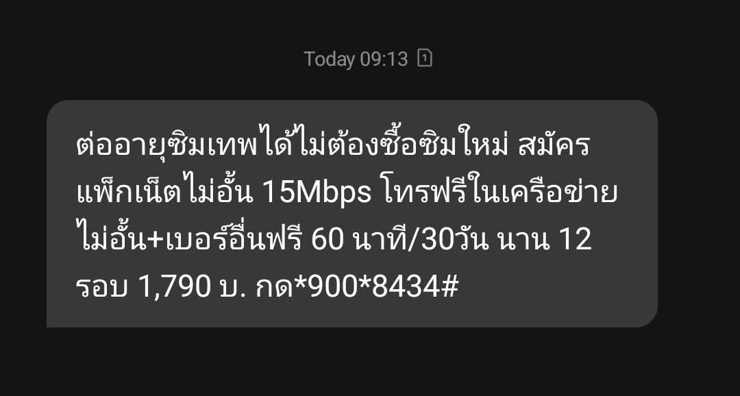 ใช้ซิมเทพธอร์อยู่ ปีที่แล้วสามารถต่ออายุได้แล้วก็มีข้อความส่งมาตามในรูป แต่ปีนี้ไม่มีข้อความส่งมาเลย อยากรู้ว่ายังสามารถต่ออายุซิมเทพได้อยู่ไหม แล้วจะได้โปรเดิมหรือเปล่า