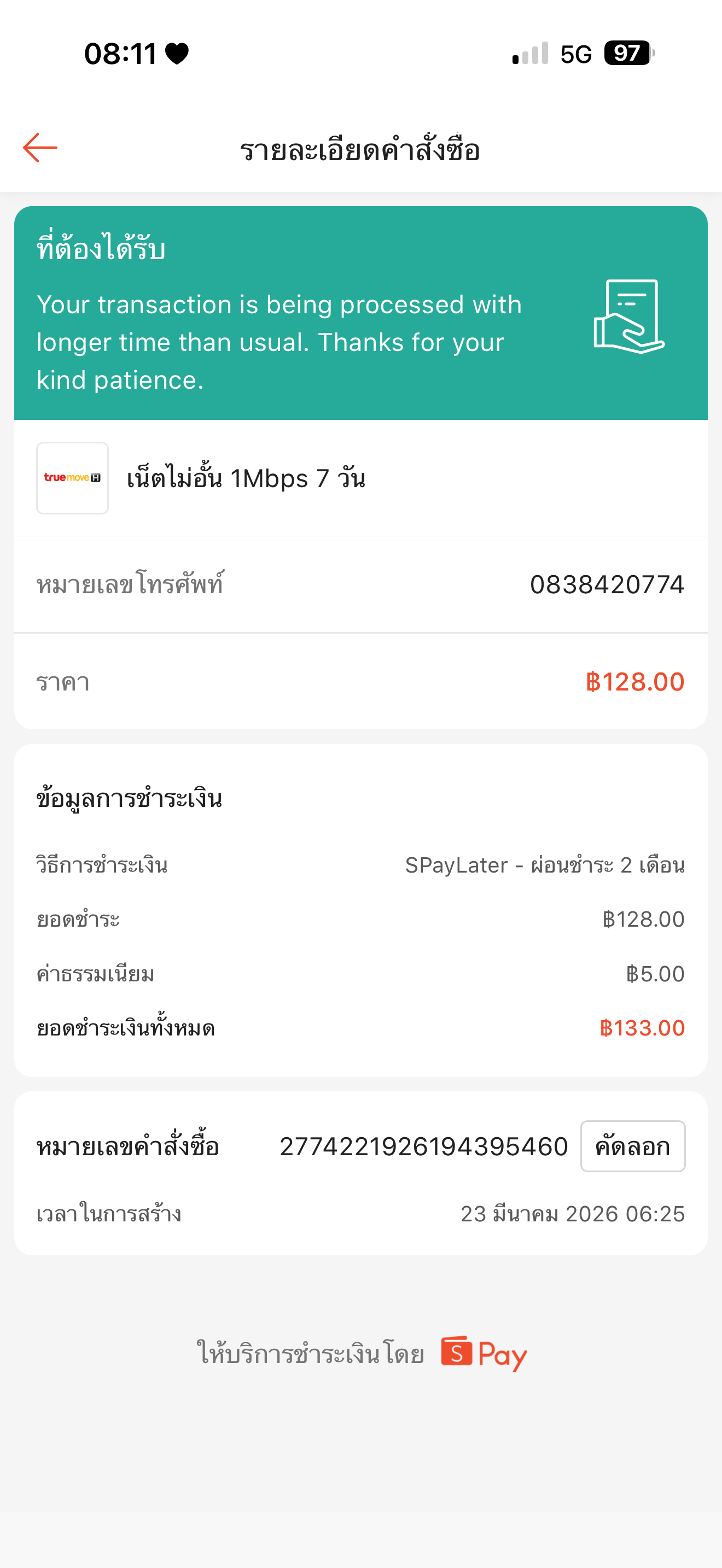 เราซื้อแพคเกจผ่านShopee รอมาจะเกือบ1วัน ยังไม่มีข้อความยืนยันว่าเริ่มใช้เน็ตได้เลย ติดต่อไปทั้ง Shopee และ true ก็ได้คำตอบไม่ตรง