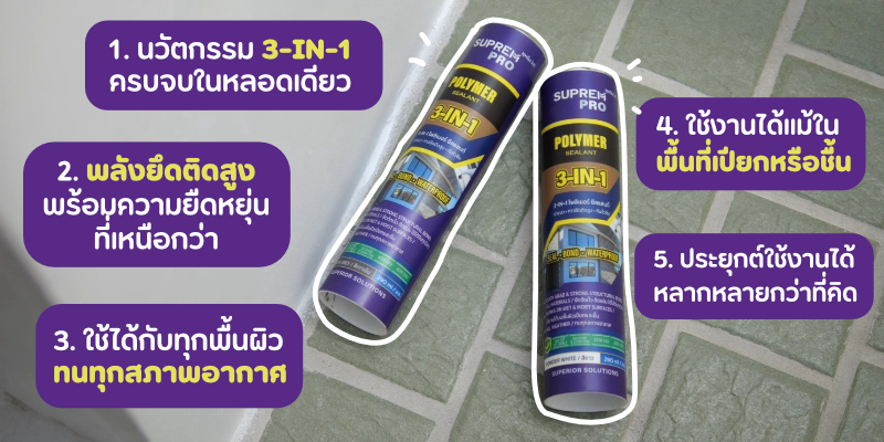 จากปัญหาที่บอกมาทุกคนจะเห็นได้ชัดเลยว่า ทุกจุดล้วนมีความต้องการเหมือนกัน คือ ต้องการยาแนวที่มีความยืดหยุ่นสูง รองรับการขยับตัวของโครงสร้างได้ดี ต้องกันน้ำได้จริงเพื่อป้องกันการรั่วซึมสะสม และต้องมีพลังการยึดติดที่แข็งแรงเพื่อให้งานซ่อมจบในครั้งเดียวโดยไม่ต้องแก้ซ้ำ และนี่จึงเป็นเหตุผลที่ SupremPro 3-IN-1 โพลิเมอร์ ซีลแลนท์ ถูกออกแบบมาเพื่อตอบโจทย์งานรีโนเวทโดยเฉพาะ ด้วยคุณสมบัติเด่นที่ถูกออกแบบมาเพื่อแก้ปัญหางานรีโนเวทได้อย่างตรงจุด ไม่ว่าจะเป็น