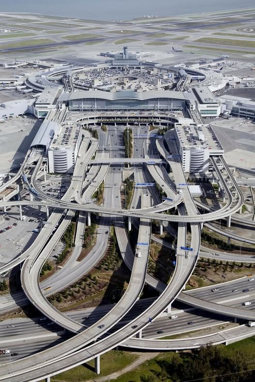 ภาพถ่ายมุมมองทางอากาศของท่าอากาศยานนานาชาติซานฟรานซิสโก (SFO) เผยให้เห็นความซับซ้อนของการออกแบบวิศวกรรมและการวางผังที่น่าทึ่งโดยเฉพาะโครงข่ายถนนและทางยกระดับที่เชื่อมต่อเข้าสู่ตัวอาคารผู้โดยสารอย่างเป็นระบบ