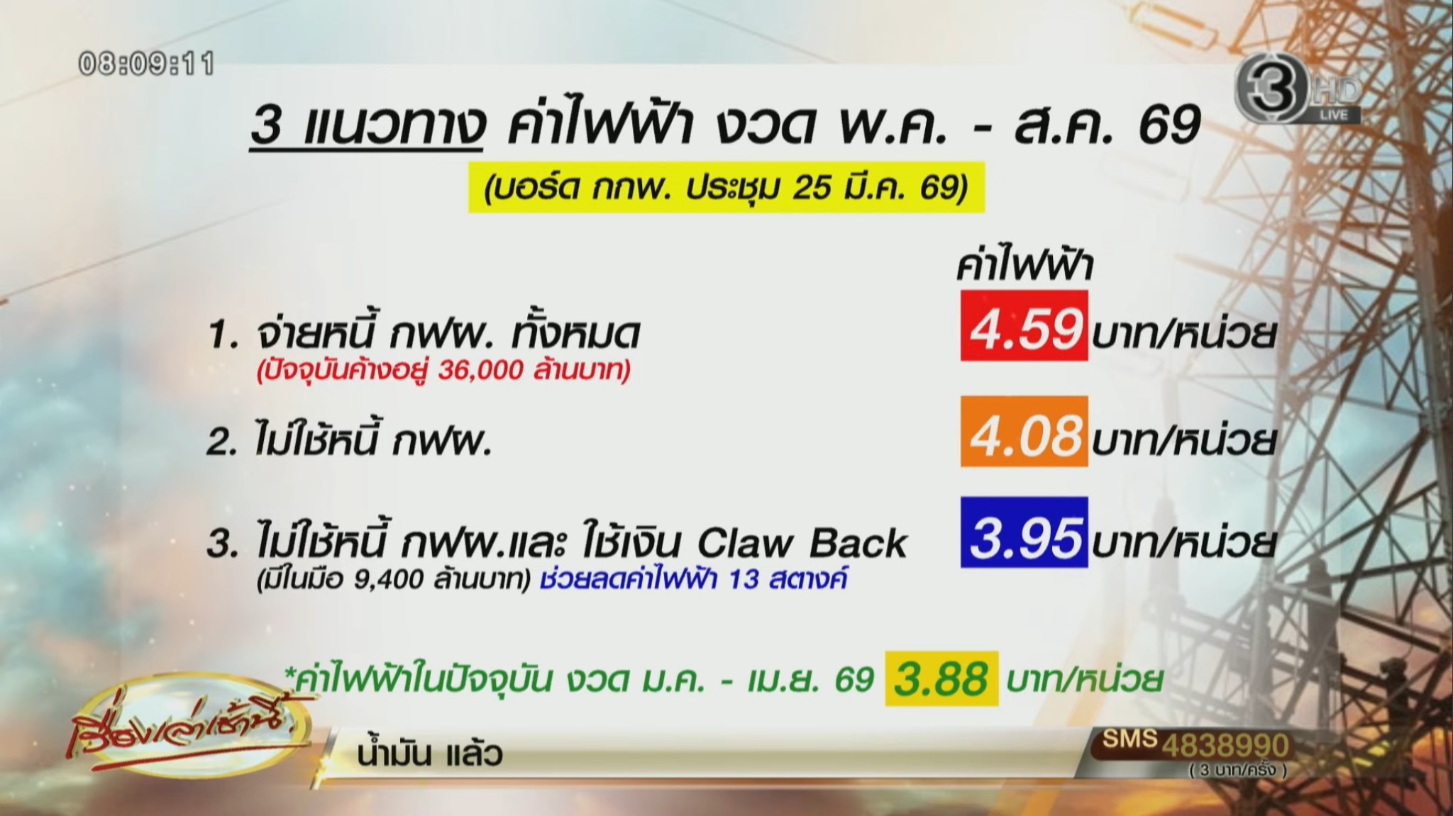 ใช้เงิน Claw Back 9,400 ล้านบาท (จาก 3 การไฟฟ้า) + ไม่คืนหนี้ AF → 3.95 บาท/หน่วย (เพิ่มแค่ 7 สต.)