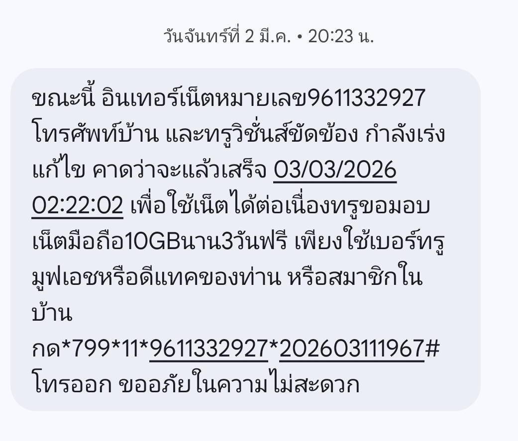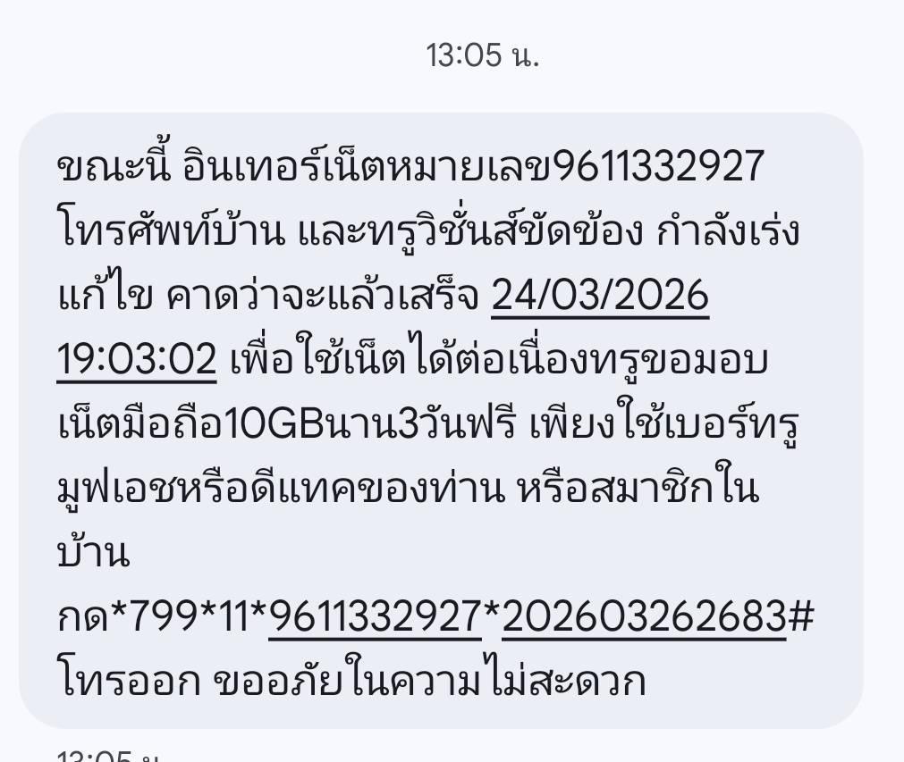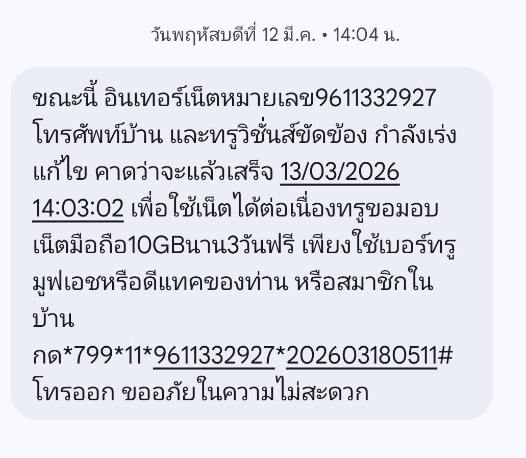 ในรอบเดือนมีนาคม 2569 นี้ สัญญาณอินเทอร์เน็ตบ้านขัดข้องไปแล้วถึง 3 ครั้ง (วันที่ 2, 12 และล่าสุดวันนี้ 24 มีนาคม) ตามหลักฐาน SMS ที่แนบมาครับ