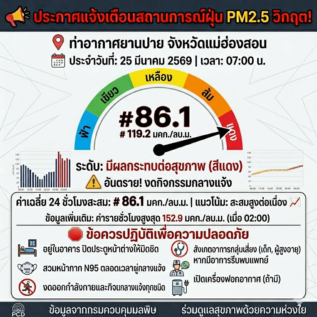 📢 [แจ้งเตือนด่วน!] วิกฤตฝุ่น PM2.5 อำเภอปาย พุ่งสูงอันตราย! (25 มี.ค. 69, 07:00 น.) สะสมสูงต่อเนื่อง 🔴🔴🔴