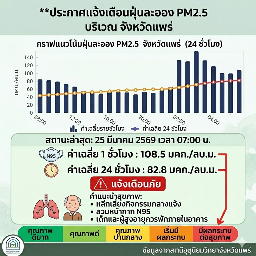 ⚠️ [แจ้งเตือนภัย] เช้านี้ (25 มี.ค. 69) ฝุ่น PM2.5 "แพร่-น่าน" วิกฤต! พุ่งสูงแตะระดับสีแดงทะลุร้อย 😷