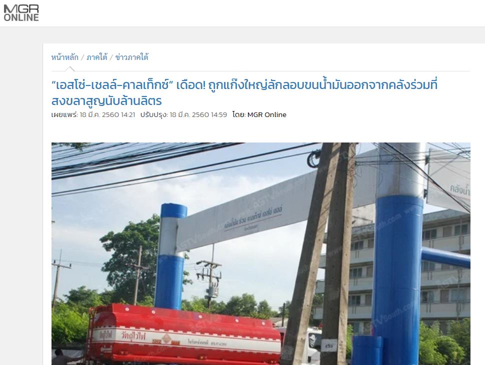 ผู้สื่อข่าวรายงานว่า เมื่อปลายสัปดาห์ที่ผ่านมา ผู้บริหารระดับสูงของบริษัทน้ำมันต่างชาติรายใหญ่ เช่น เชลล์ เอสโซ่ และคาลเท็กซ์ ได้เดินทางลงพื้นที่ภาคใต้เพื่อตรวจสอบคลังน้ำมันที่ อ.สิงหนคร จ.สงขลา ซึ่งเป็นคลังร่วมของทั้ง 3 บริษัทยักษ์น้ำมันต่างชาติดังกล่าว  เนื่องจากได้รับรายงานว่า มีการขโมยน้ำมันในจากในคลังร่วมแห่งนี้สูญหายไปแล้วกว่า 1 ล้านลิตร