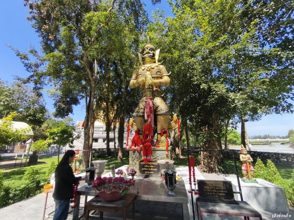 ถัดออกมาจากเจดีย์ บริเวณริมน้ำจะเป็นองค์ ท้าวเวสสุวรรณ ยืนสง่างามให้ผู้คนได้เข้ามาสักการะ โดยจะมีพวงมาลัยแดง และธูปให้บริการอยู่บริเวณนั้น