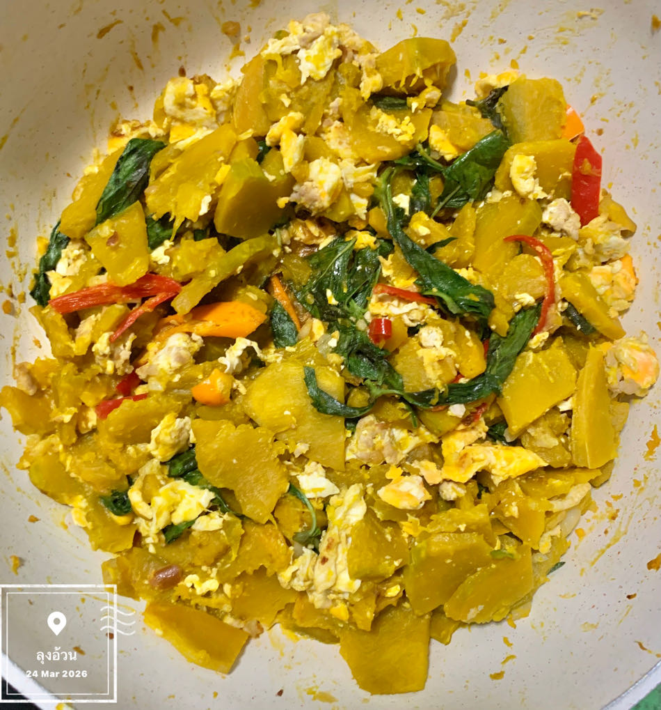 (2)ผัดฟักทองใส่ไข่และเต้าเจี้ยวใบโหระพาเป็นเมนูทำง่ายที่หอมหวนและรสชาติกลมกล่อมเตรียมฟักทองหั่นชิ้น, ไข่ไก่, เต้าเจี้ยว, ใบโหระพา, และกระเทียม ผัดกระเทียมกับเต้าเจี้ยวให้หอม ใส่ฟักทองและน้ำเล็กน้อยผัดจนสุก ปรุงรสด้วยน้ำมันหอย ใส่ไข่ลงไปผัดจนสุกดี ปิดท้ายด้วยใบโหระพาเพื่อความหอม