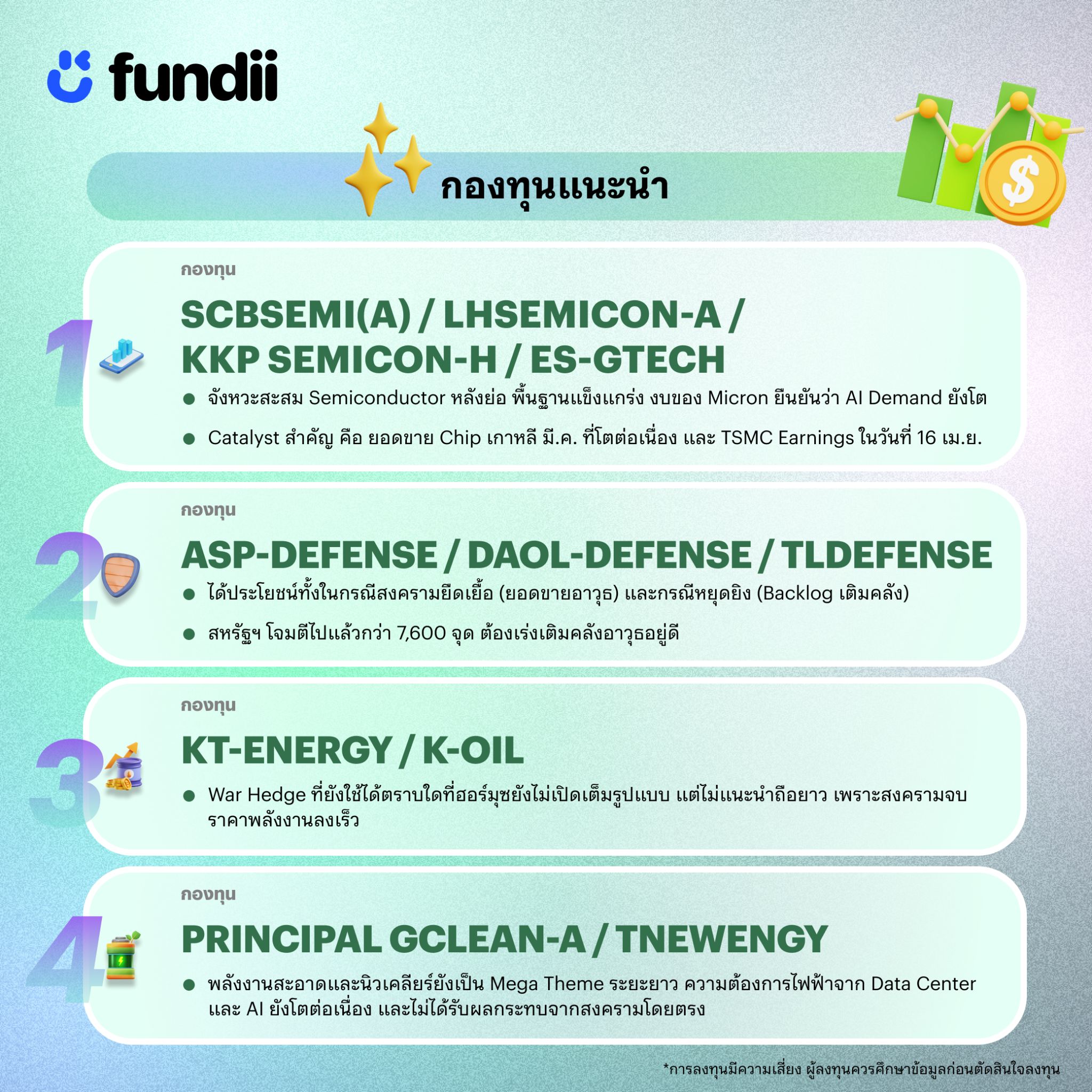ตลาดยังอยู่ในโหมด Risk-off จากธนาคารกลางที่ Hawkish มากขึ้น และสงครามที่ยังไม่จบ แต่ตลาดได้ Price in Worst Case ไปพอสมควรแล้ว สะท้อนจากการที่ตลาดพลิกมองว่า Fed จะ "ขึ้นดอกเบี้ย" แทนที่จะ "ลด" ซึ่งถือว่ามองในแง่ร้ายพอสมควร ดังนั้นการลงทุนในธีมที่มีพื้นฐานรองรับเช่น Semiconductor / Technology ค่อนข้างน่าสนใจ