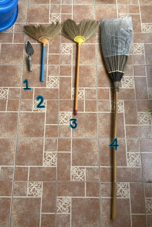 ถ้าบ้านไหนมีอุปกรณ์เลข2 ซึ่งคือ อุปกรณ์เลข3ที่ด้ามหักแต่ยังเก็บไว้ เอามานั่งริมระเบียงกวาด ก็จะง่ายค่ะ