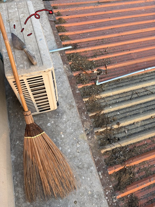 3. จากนั้น ลุยกวาดขี้นกบนหลังคา โดยเริ่มจากแซะซอกที่เป็นแง้ง ๆ หลังคาก่อน (ตามภาพ)
