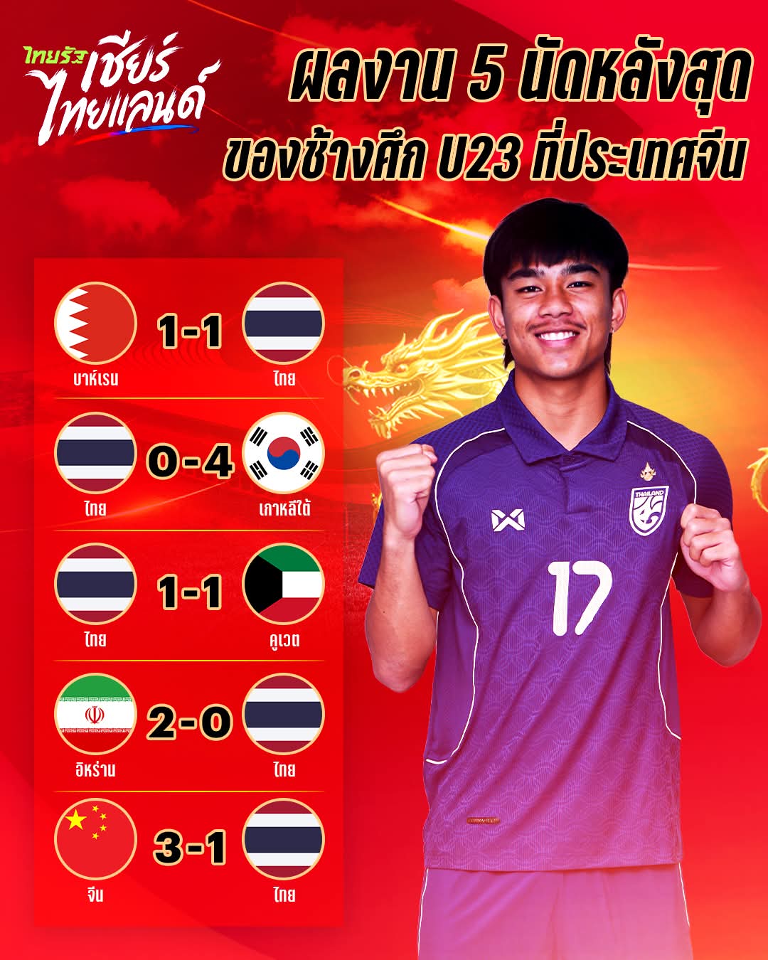 l MATCHDAY ศึก CFA 4 เส้า 'ช้างศึกU23' VERSUS 'มังกรU23' --- ไทยชนะแบบเพลียๆ ไม่มีเสมอ --- !!!
