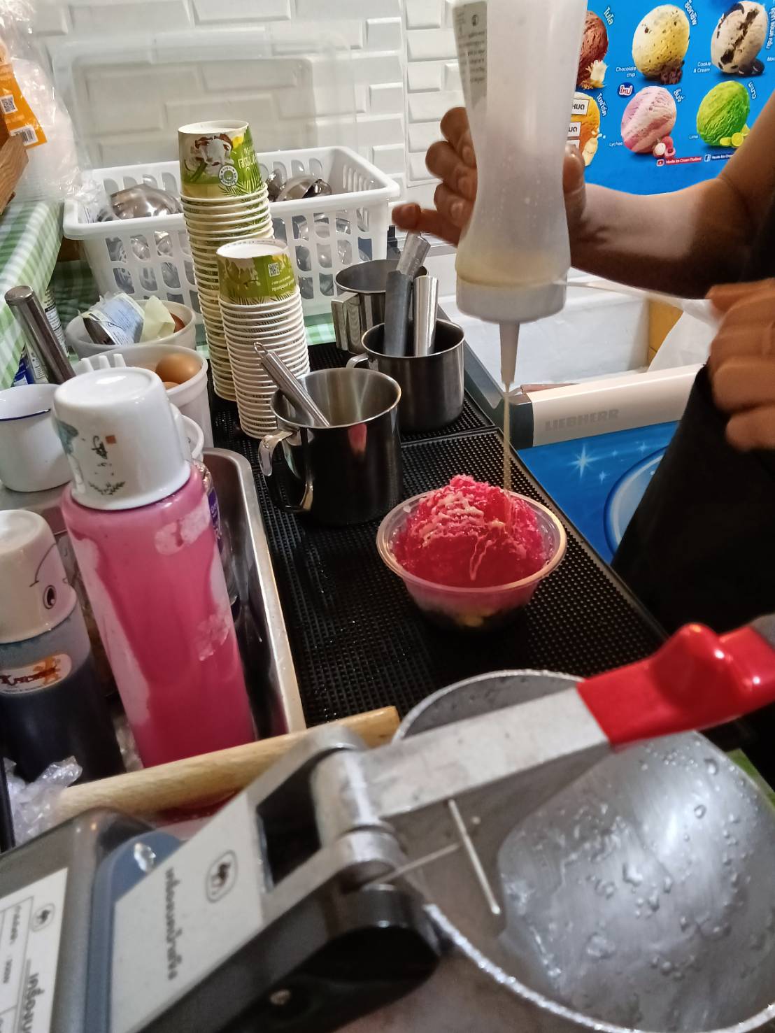อากาศร้อนจัดๆ สลับฝนตก แต่ก็ยังร้อน เมื่อเช้าเลยเข้าไปในตลาดนนท์ ซื้อเครื่องที่ใส่ในน้ำแข็งไสมา ร้านนี้เขาทำของเองราคาเลยไม่แพง เมื่อก่อนทางร้านขายเครื่องใส่น้ำแข็งเยอะมา