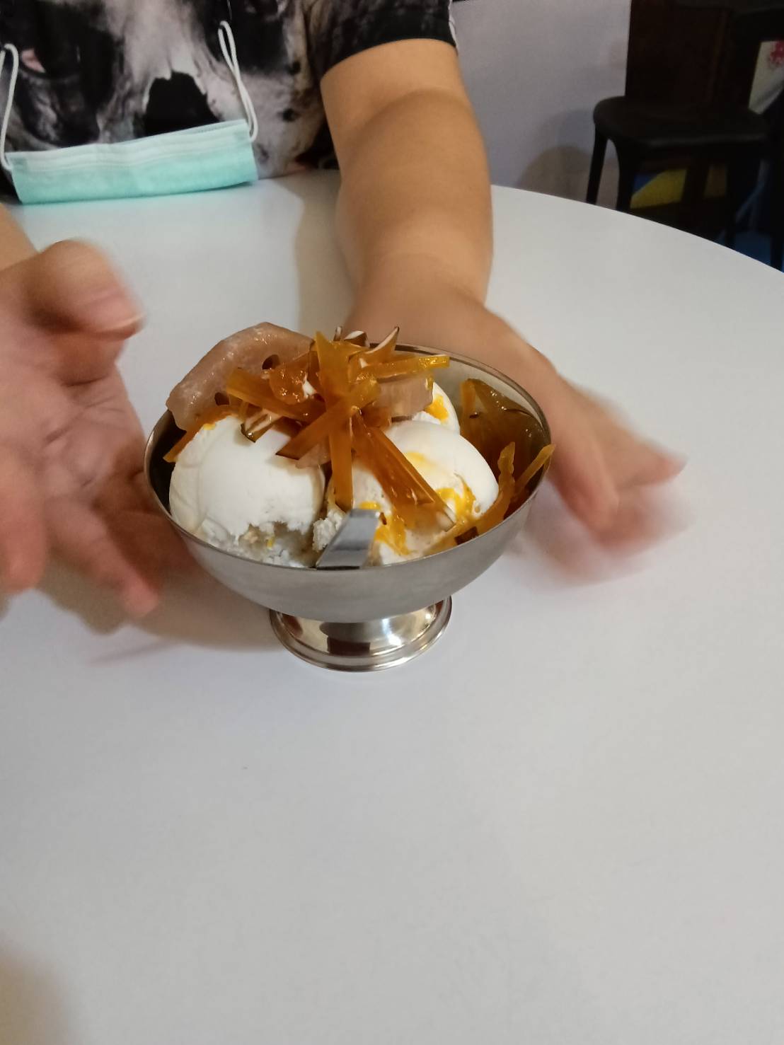 น้ำแข็งไส ใส่ถั่วแดง กับ แปะก๊วย + ไอศกรีมไข่แข็ง ใส่ฟักทองเชื่อม กับ รากบัวต้ม คลายร้อนกันไปได้จ้า