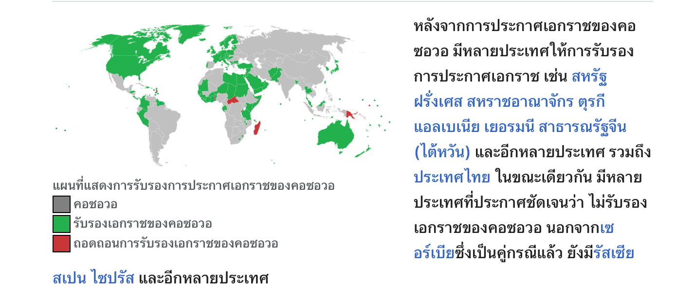 Republika e Kosovës) มีการรับรองจากบางประเทศ ในขณะที่เซอร์เบียยังคงถือว่าคอซอวอเป็นจังหวัดปกครองพิเศษของตน