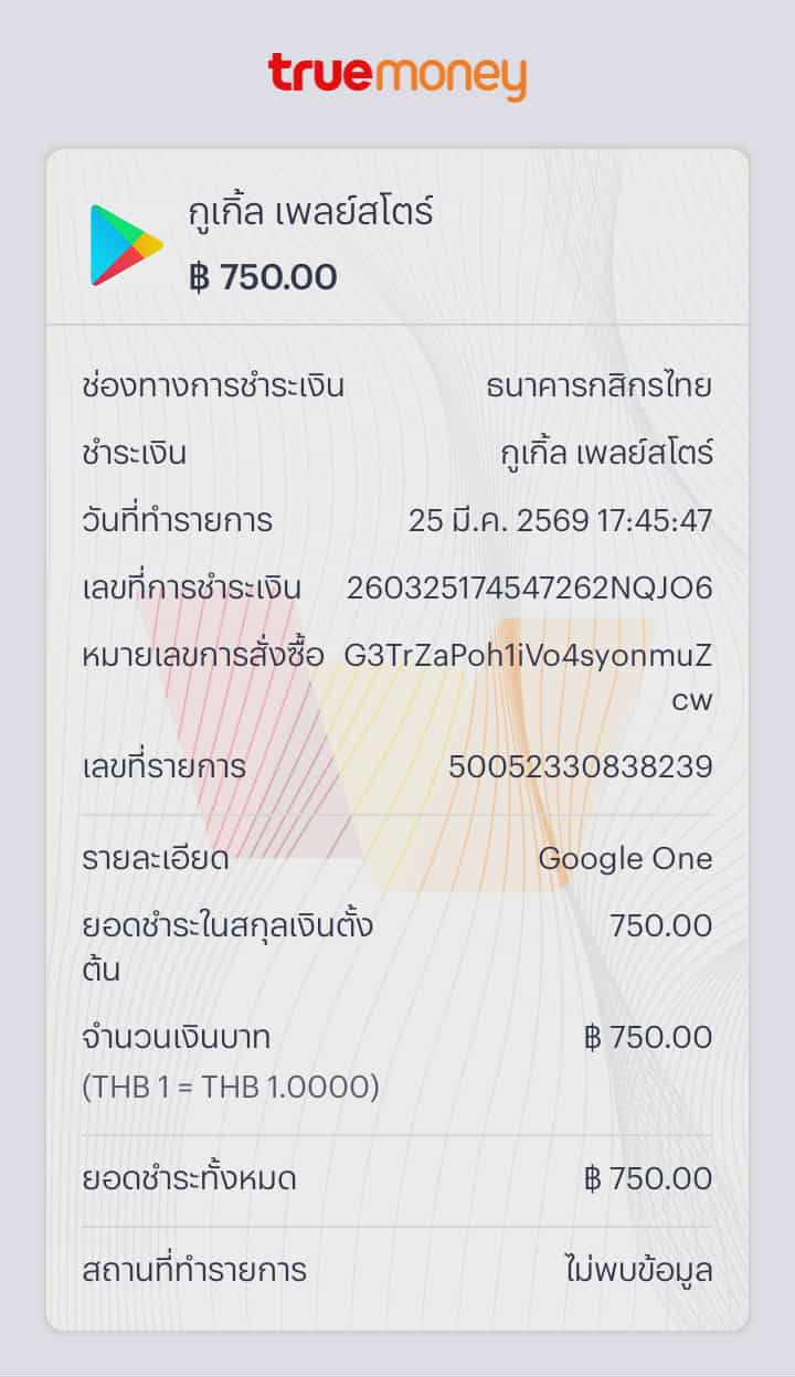 พอดีผูกtrue walletกับkplas พอมีเงินใบบชถึงยอดก็โดนหักเข้าtrueและก็ชำระ google one เลย ครั้งนี้ครั้งที่2 แล้วครับ