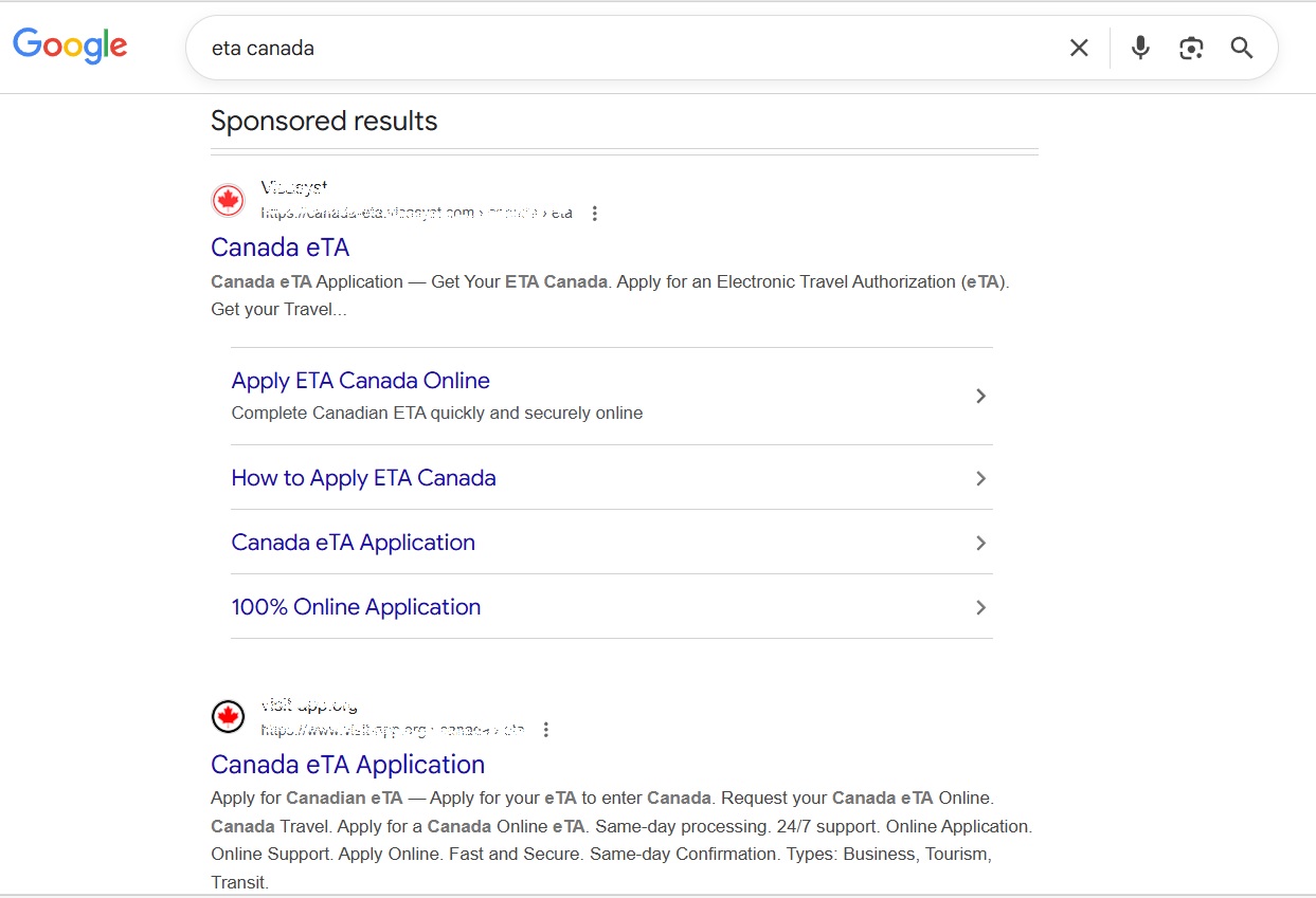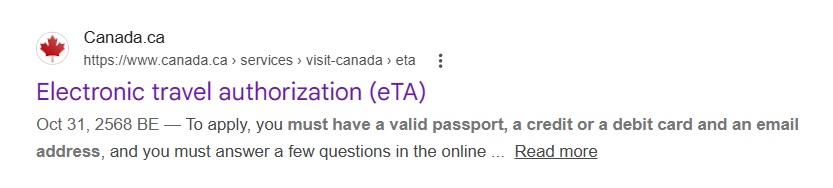 รู้แบบนี้ผมก็เข้า Google และ Search ด้วยคำว่า "eta canada" จากนั้นก็คลิกเว็บไซต์แรกที่ขึ้นมาโดยไม่สนใจเลยว่ามันคือ Sponsored Result