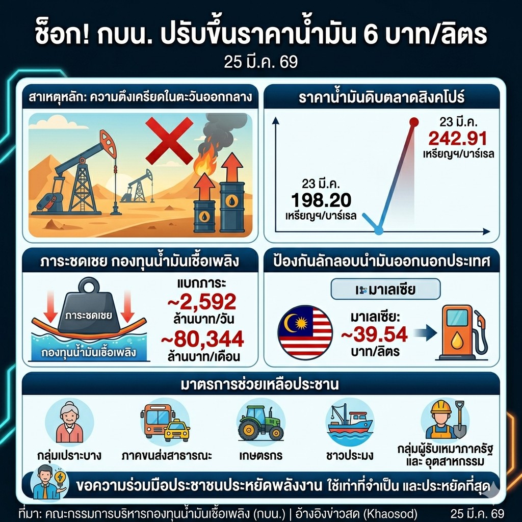สวัสดีเพื่อนๆ ชาวพันทิปครับ วันนี้มีข่าวใหญ่ที่กระทบกระเป๋าตังค์พวกเราทุกคนเต็มๆ เมื่อคณะกรรมการบริหารกองทุนน้ำมันเชื้อเพลิง (กบน.) มีมติให้ ปรับขึ้นราคาน้ำมันทั้งกลุ่มดีเซลและเบนซิน รวดเดียว 6 บาท/ลิตร! (อ้างอิงข่าววันที่ 25 มี.ค. 2569)