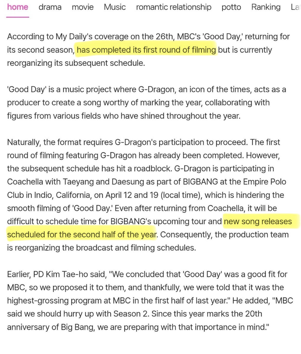 BIGBANG จะปล่อยอัลบั้มใหม่ในช่วงครึ่งปีหลังของปีนี้ หลังจาก รายการ Good Day ของ G-DRAGON ได้มีการบันทึกเสร็จเรียบร้อยไปในส่วนแรกแล้ว