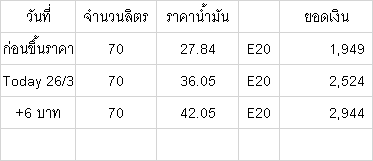 ถ้าคำนวณที่ราคาน้ำมันที่คาดว่ารัฐบาลจะขึ้นอีก 6 บาท = 42.05 บาท/ลิตร ... ค่าน้ำมันเพิ่มขึ้นเดือนละ 995 บาท (โดยประมาณ)