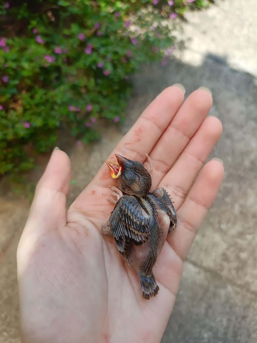 . . . . เหตุเกิดตั้งแต่เมื่อวาน... ตอนแรกเขาน่าจะตกลงมาบนหลังคาก่อน พอดีที่บ้านเรามีแมว แมวก็เห็นก็เลยไล่ลงมาตกมาที่พื้นอีกที เราก็ตกใจรีบตะครุบเลยค่ะ เท่าที่ตรวจดูก็ไม่มีแผลนะคะ ตอนแรกคิดว่ามาหัดบิน