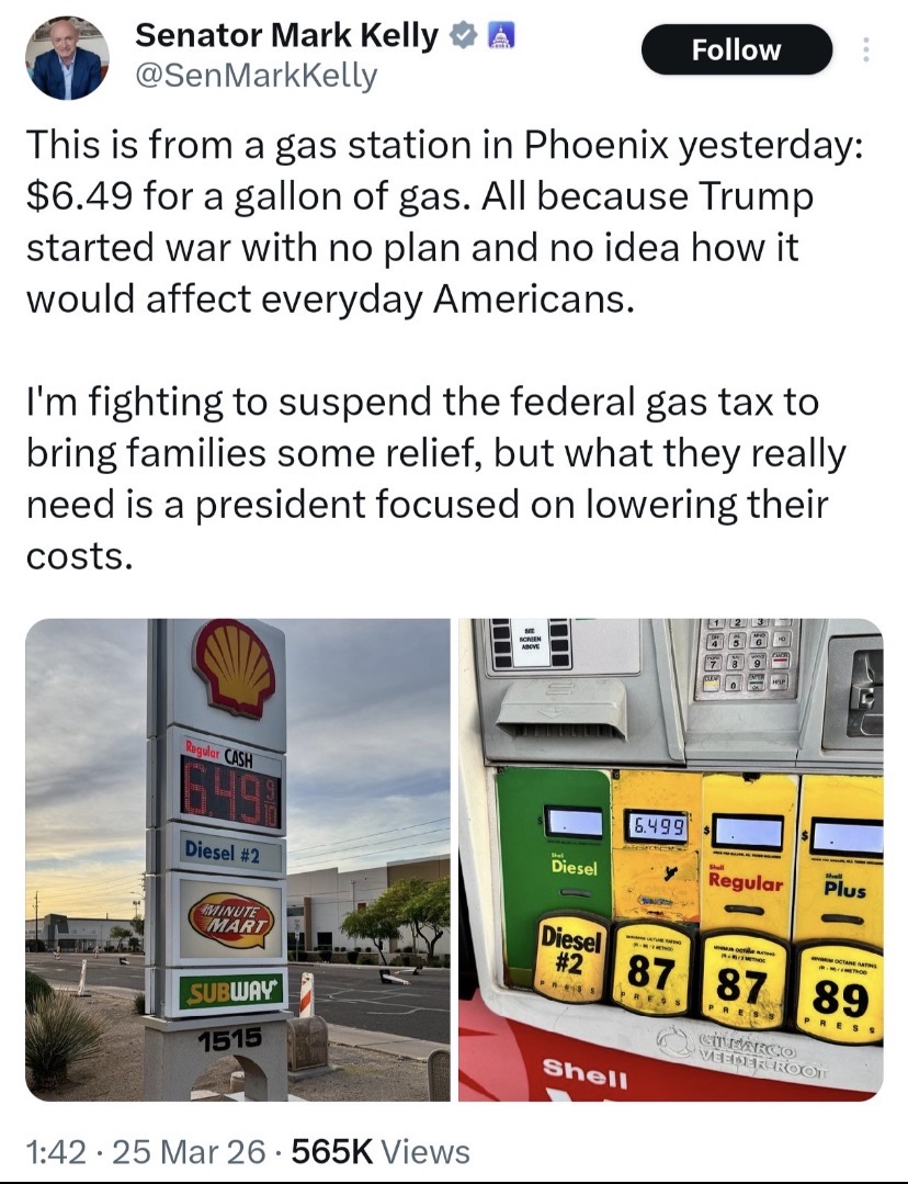 "นี่คือราคาน้ำมันจากปั๊มน้ำมันแห่งหนึ่งในฟีนิกซ์เมื่อวานนี้: น้ำมันหนึ่งแกลลอนราคา 6.49 ดอลลาร์ ทั้งหมดเป็นเพราะทรัมป์เริ่มสงครามโดยไม่มีแผนการและไม่รู้เลยว่ามันจะส่งผลกระทบต่อชาวอเมริกันทั่วไปอย่างไร"