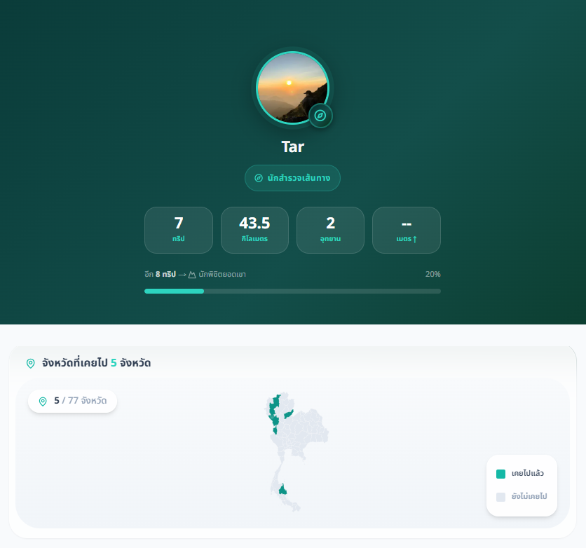 ระบบรวม km / จำนวนทริป / จังหวัดที่เคยไปให้อัตโนมัติ เห็นพัฒนาการตัวเองได้ชัด