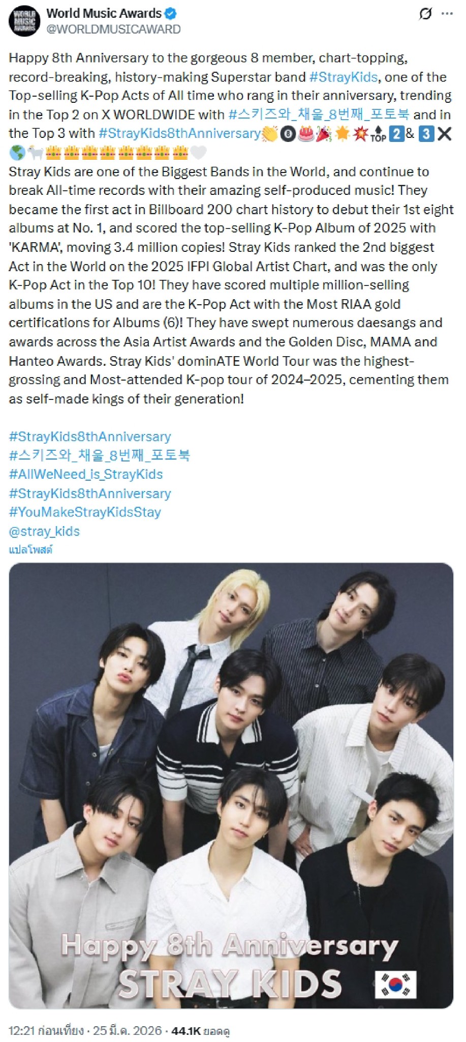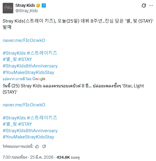 🔥 Stray Kids : พวกเราถ่ายรูปครอบครัวฉลองครบรอบ 8 ปี...ผ่านมาแล้ว 8 ปี...ไม่อยากเชื่อเลย...วันที่ 25 มีนาคม เพลงที่ฉันทุ่มเททำอย่างหนักชื่อ STAY ก็จะปล่อยออกมาด้วย เป็นเพลงที่เราใส่ความรู้สึกจากใจจริงลงไปมากมาย โดยคิดถึง STAY อยู่ตลอด (จาก ซึงมิน SKZ)