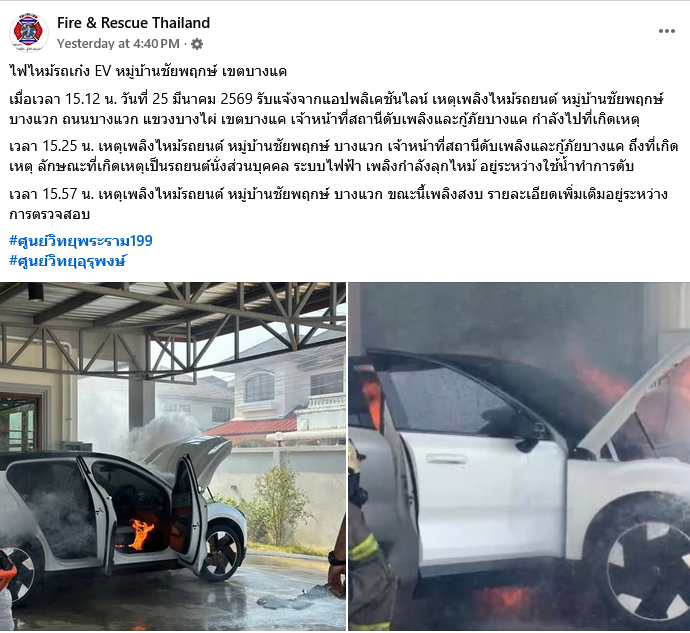 จากกรณีไฟไหม้รถยนต์ไฟฟ้า ภายในหมู่บ้านชัยพฤกษ์ บางแวก ถนนบางแวก แขวงบางไผ่ เขตบางแค เมื่อช่วงบ่ายของวันที่ 25 มีนาคม 2569 ที่ผ่านมา ซึ่งเหตุการณ์ดังกล่าวได้ถูกเผยแพร่ผ่านสื่อสังคมออนไลน์และได้รับความสนใจจากประชาชนในวงกว้าง