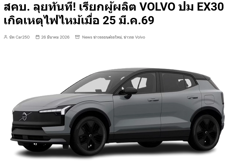 ครบรอบหนึ่งเดือนพอดี 25 ก.พ. 69 ด่วน วอลโว่ คาร์ เรียกคืน Volvo EX30 ในไทย 1,668 คัน เปลี่ยนแบตเตอรี่ใหม่