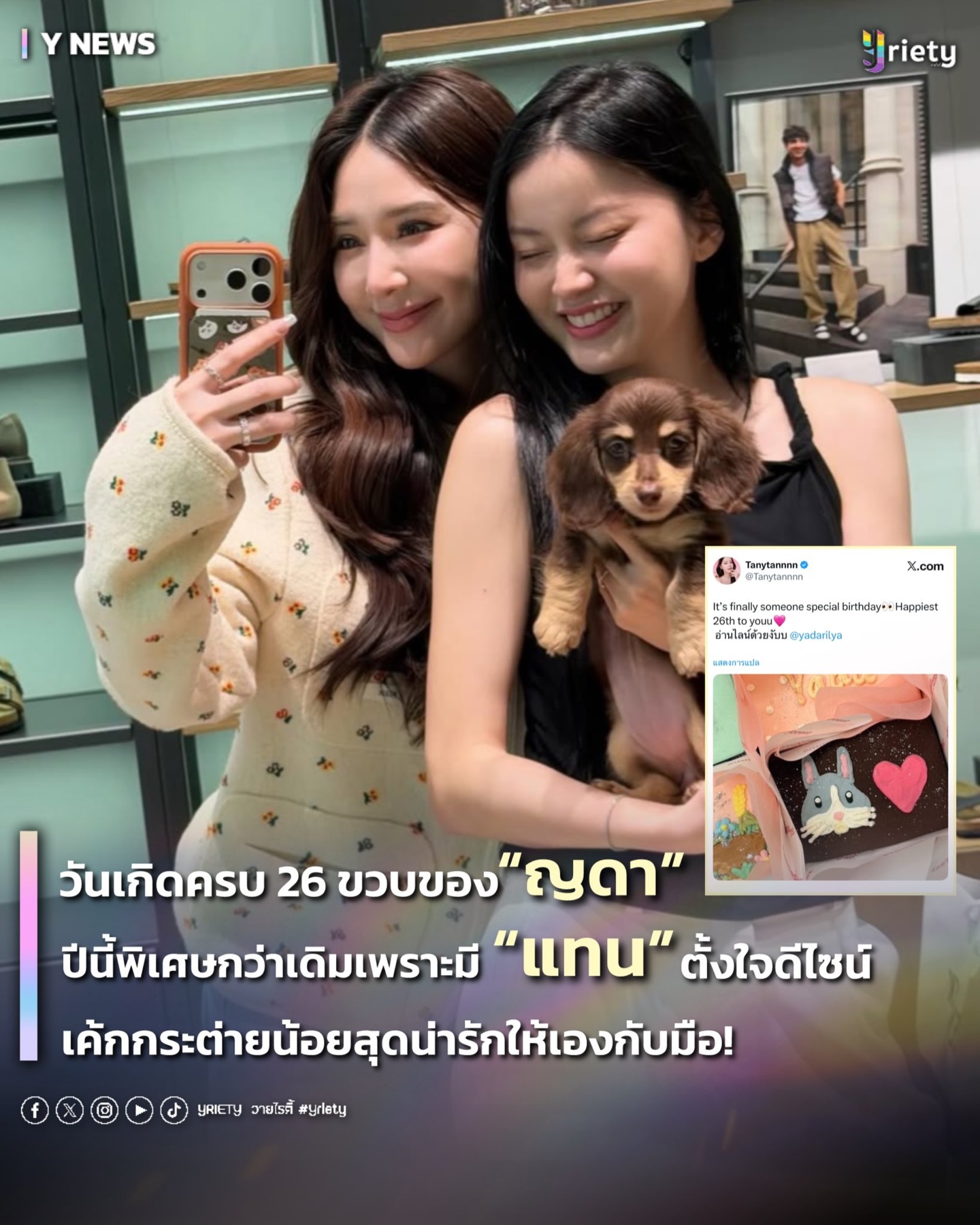 เรียกได้ว่าเติบโตมาอย่างดีสุด ๆ สำหรับพี่ดาราสาวคนเก่งอย่าง “ญดา นริลญา” #yadarilya ที่ปีนี้ก้าวเข้าสู่วัย 26 ขวบเเล้ว! แถมยังตรงกับวันดี 26.26.26 แบบพอดีเป๊ะ 💥 ซึ่งความพิเศษมันไม่ใช่แค่ตัวเลข แต่เป็นความใส่ใจของ “แทน” #tanytannn ที่ได้ออกมาเสิร์ฟความน่ารักผ่าน X ด้วยภาพเค้กกระต่ายสุดคิ้วท์ที่เจ้าตัวตั้งใจดีไซน์เอง 🐰🎂 พร้อมแคปชั่น “It’s finally someone special birthday 👀 Happiest 26th to youu 🩷 อ่านไลน์ด้วยงับบ @yadarilya” แค่เปิดมาก็ทำเอาใจฟูตั้งแต่ต้นวันกันเลยทีเดียว~