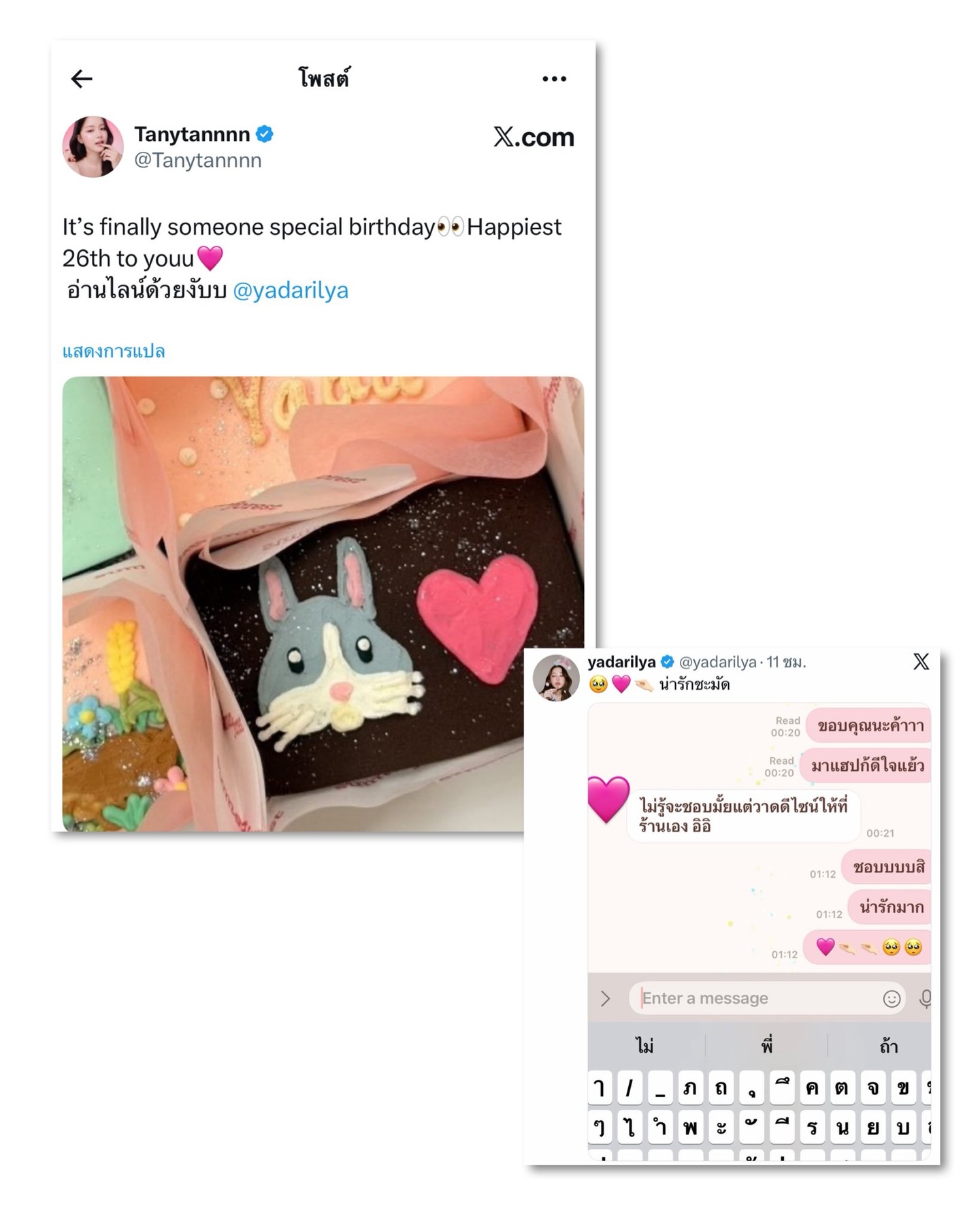 “แทน” #tanytannn ที่ได้ออกมาเสิร์ฟความน่ารักผ่าน X ด้วยภาพเค้กกระต่ายสุดคิ้วท์ที่เจ้าตัวตั้งใจดีไซน์เอง 🐰🎂 พร้อมแคปชั่น “It’s finally someone special birthday 👀 Happiest 26th to youu 🩷 อ่านไลน์ด้วยงับบ